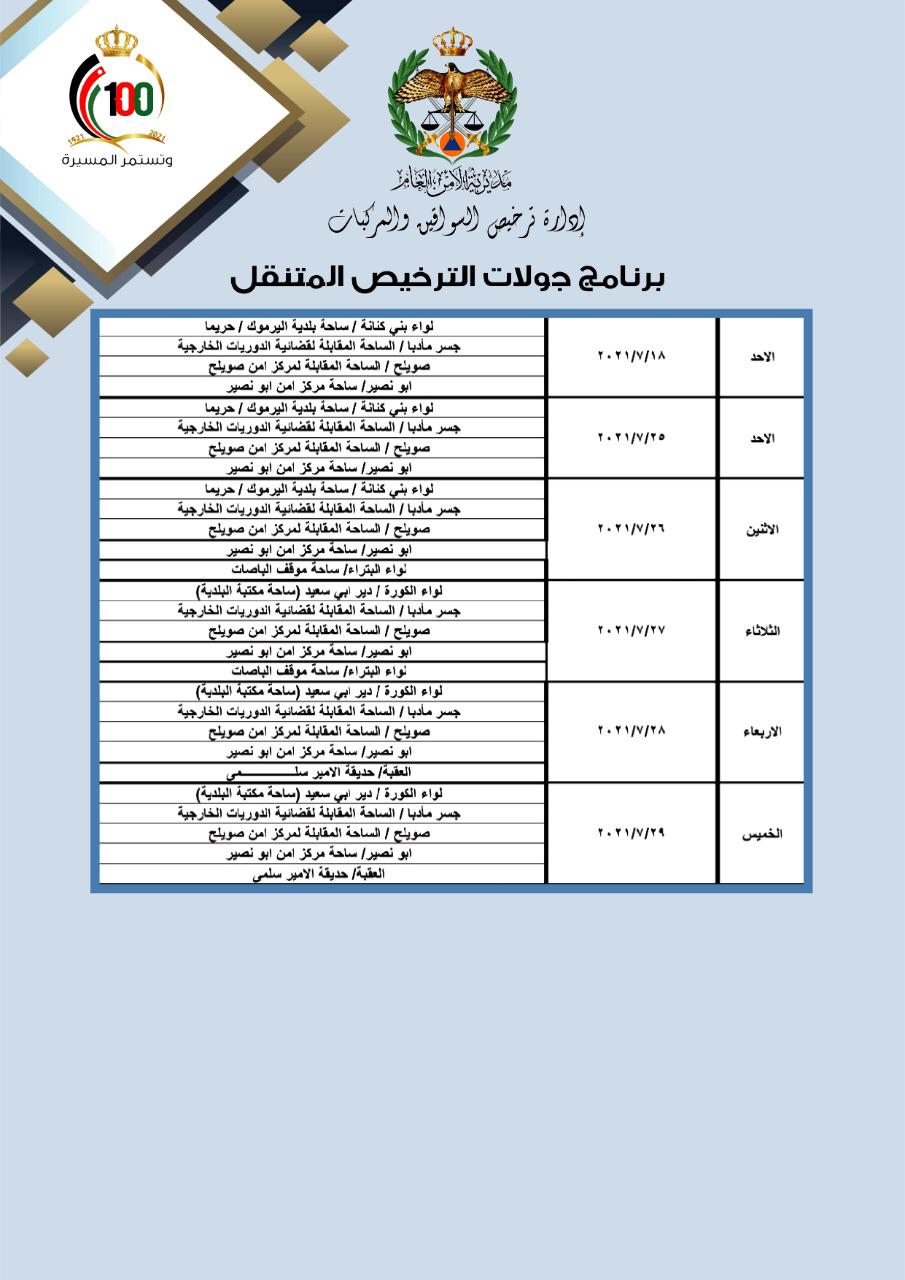 أحداث اليوم - أعلنت إدارة ترخيص السواقين والمركبات عن مواعيد العمل بجولات الترخيص المتنقل ضمن المبادرة الابتكارية ( بنوصلك ) خلال شهر تموز في عدد من مناطق المملكة، حيث ستكون ساعات الدوام للترخيص المتنقل من الساعة 8:00 صباحاً وحتى الساعة 2:00 ظهراً.