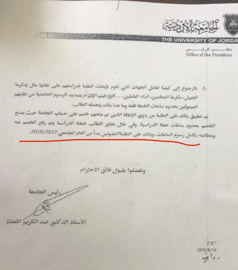 وذكرت الحملة في بيان أن الجامعة الاردنية لاحقًا قامت باستصدار قرار يلزم الطالب من الاشخاص ذوي الاعاقة بدفع الرسوم كاملة في حالة تسجيل الطالب للمواد الاستدراكية والمواد المعادة.