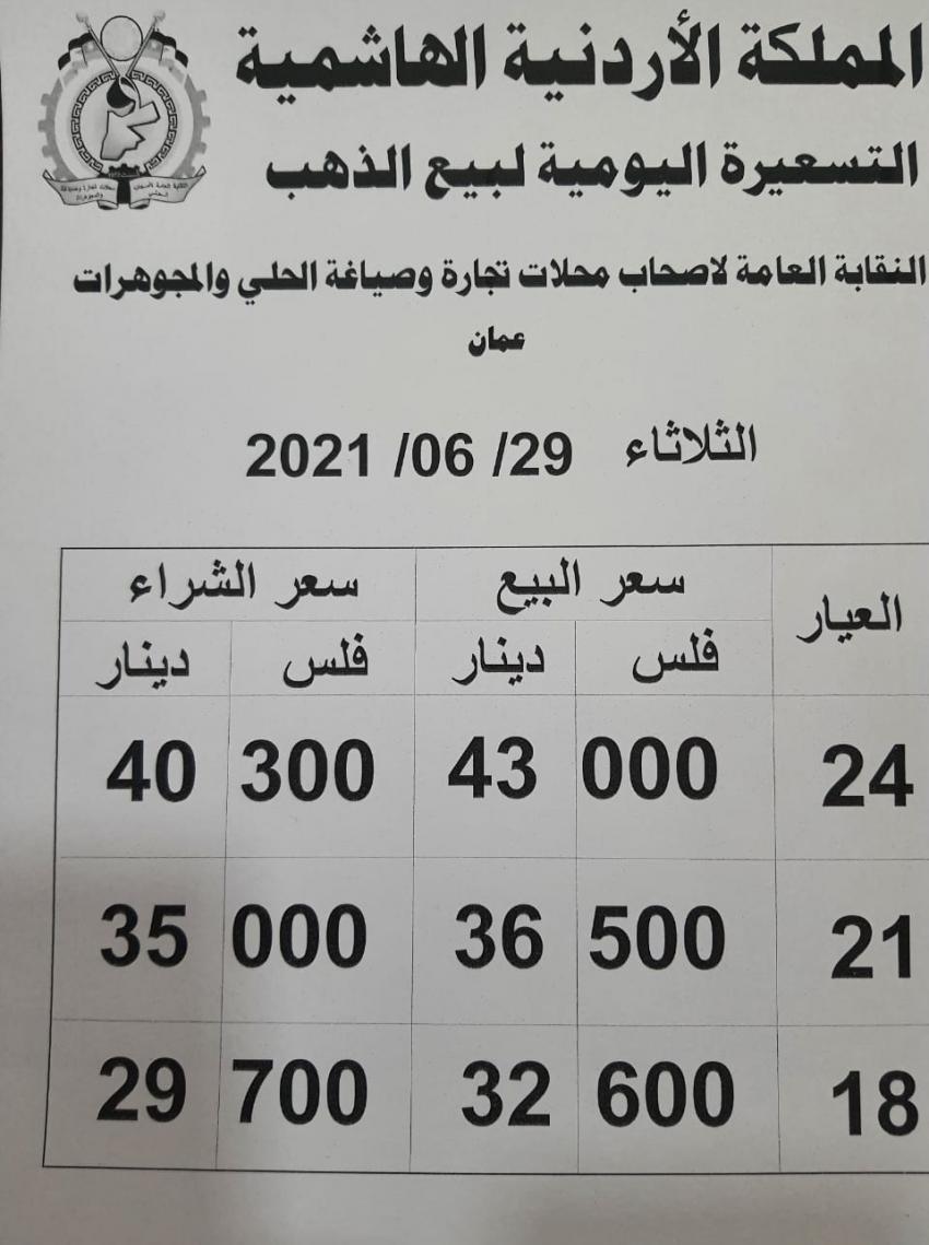 وبلغ سعر بيع الغرام من الذهب عياري 24 و18 لغايات الشراء من محلات الصاغة عند 43.00 و32.60 دينارا على التوالي.