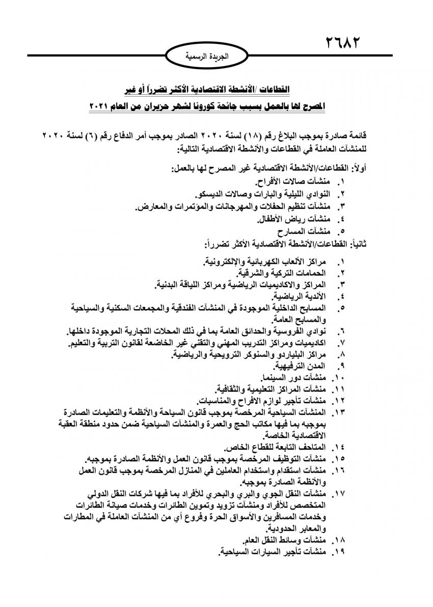 أحداث اليوم - أعلنت الحكومة في عدد الجريدة الرسمية اليوم الخميس القطاعات والأنشطة الاقتصادية الأكثر تضرراً أو غير المصرح لها بالعمل بسبب جائحة كورونا لشهر حزيران من العام 2021.وتاليا القطاعات: