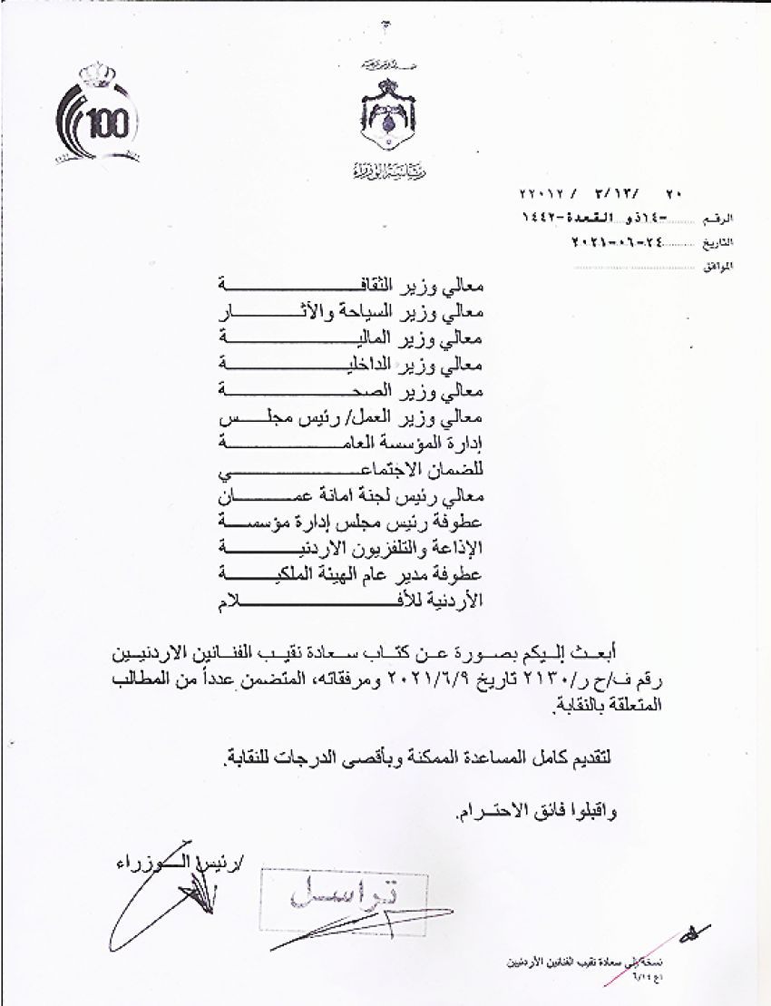 أحداث اليوم - أوعز رئيس الوزراء الدكتور بشر الخصاونة لكافة الجهات المعنية، بضرورة تقديم كامل المساعدة الممكنة وبأقصى الدرجات لنقابة الفنانين الأردنيين.