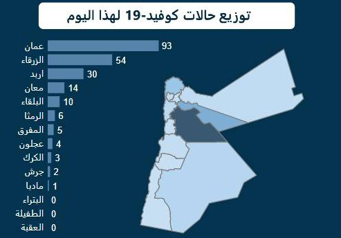 واستمرت عمان في صادرة المحافظات بتسجيل 93 إصابة تليها الزرقاء بـ54 إصابة.