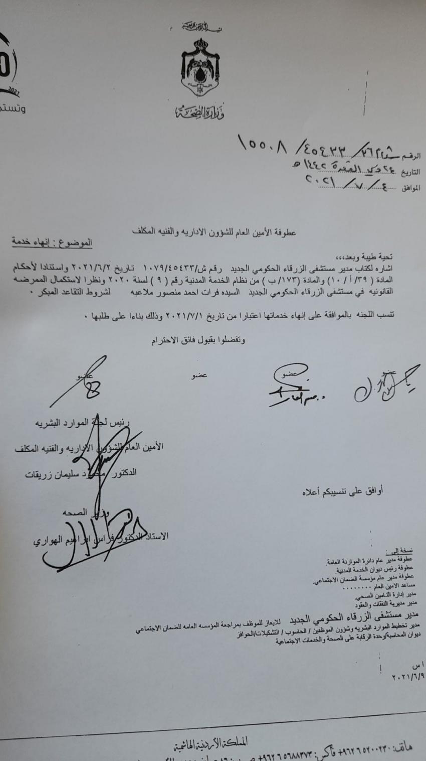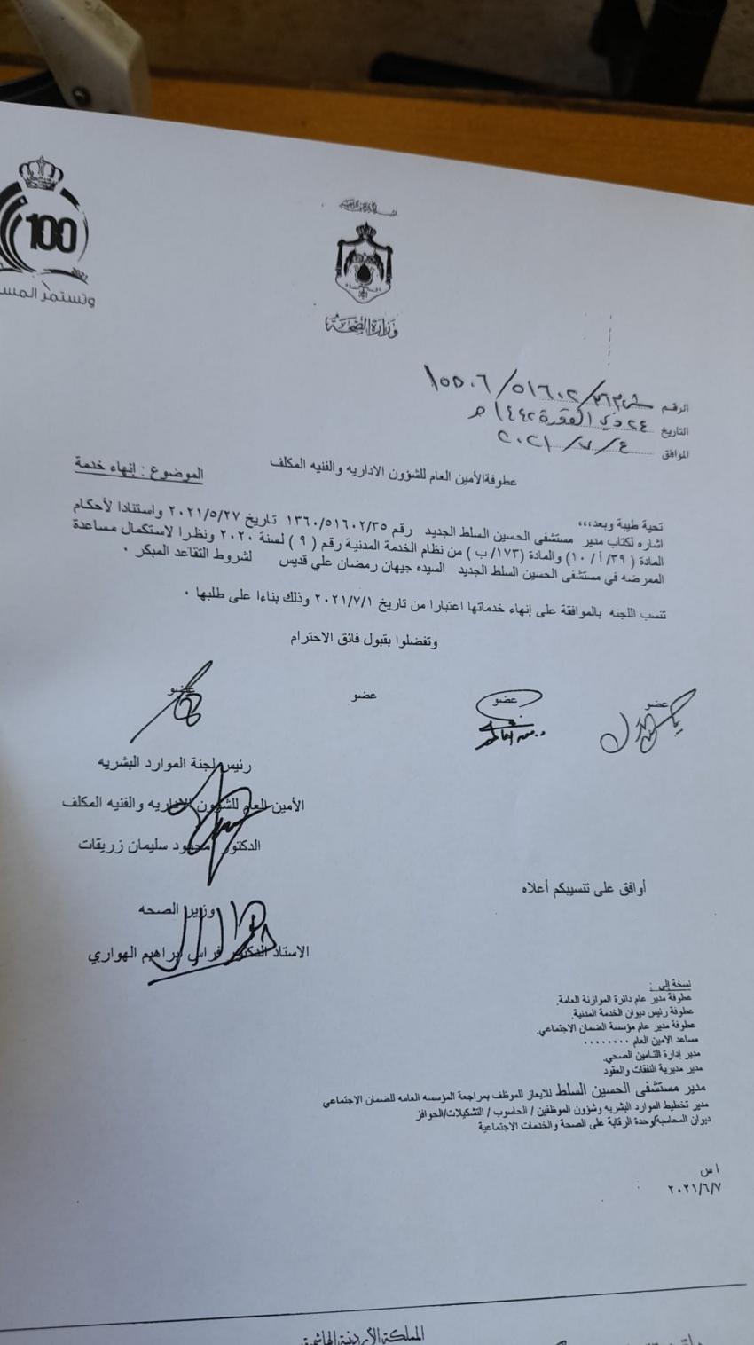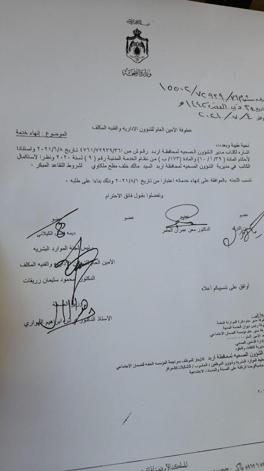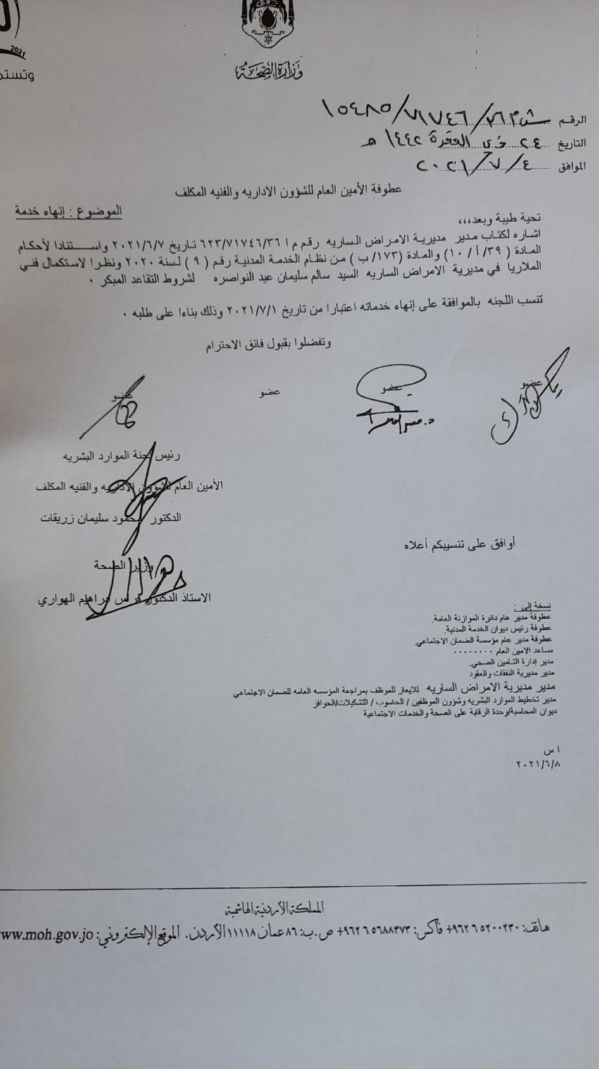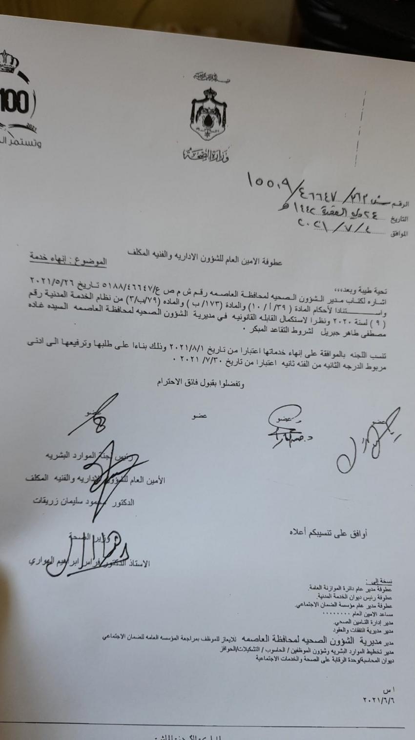 أحداث اليوم - قرر وزير الصحة الدكتور فراس الهواري، اليوم الأحد، الموافقة على إحالة عدد من الموظفين في الوزارة إلى التقاعد بناء على طلبهم.وتاليا الأسماء: