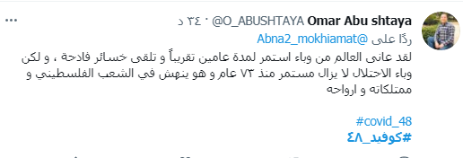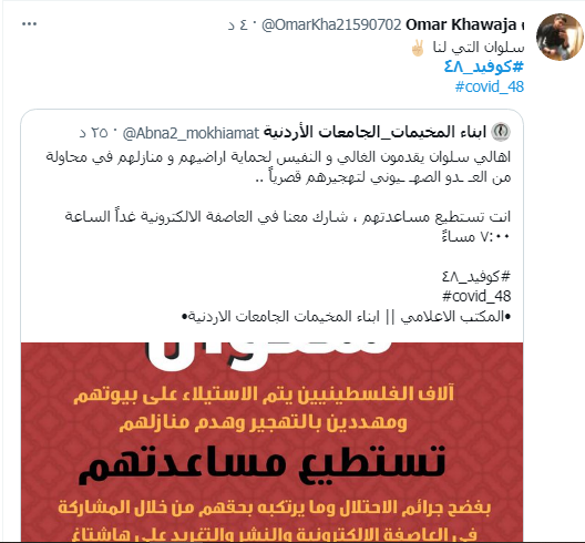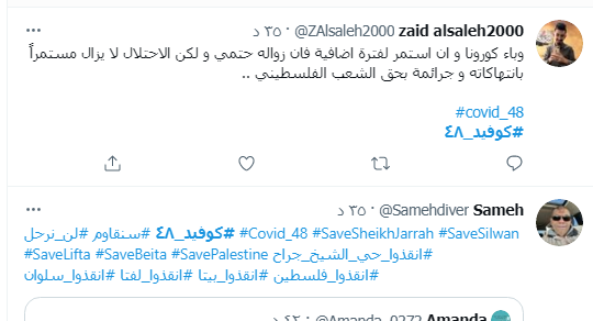 أحداث اليوم - دشن نشطاء مواقع التواصل الإجتماعي عاصفة إلكترونية بالتغريد على وسم #كوفيد_48 في إشارة على وباء الاحتلال الصهيوني القابع من عغام 1948 الذي ما زال يحاصر حي الشيخ جراح وسلون في القدس المحتلة.