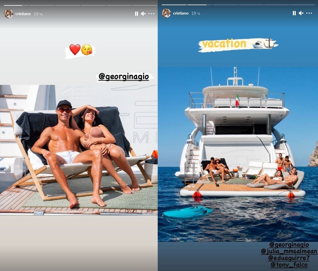 ونشر رونالد عبر حسابه على موقع "إنستغرام" في خاصية ستوري، صورا رفقة صديقته عارضة الأزياء الإسبانية جورجينا رودريغيز وأطفالهما، على متن يخت أثناء قضاء العطلة الصيفية، مع إضافة رموز "إيموشين" تعبيرية للحب.