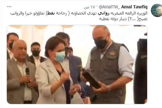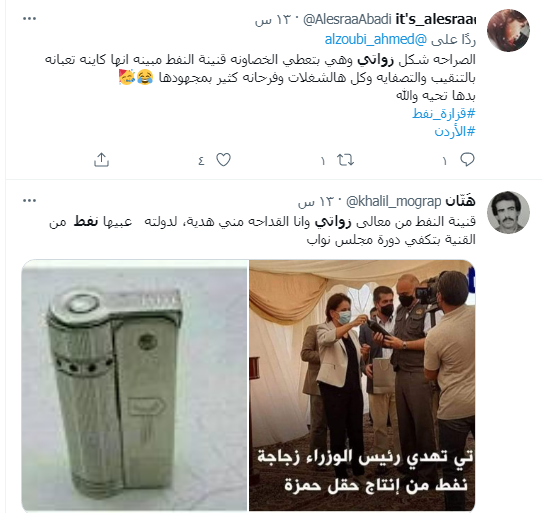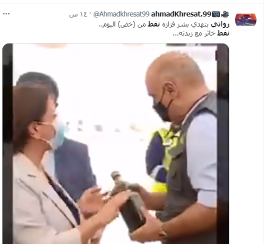 تفاعل نشطاء مواقع التواصل الإجتماعي مع "زجاجة النفط" التي أهدتها وزيرة الطاقة هالة زواتي لرئيس الوزراء بشر الخصاونة، خلال تدشين الاخير مرحلة جديدة لتأهيل حقل حمزة النفطي ورفع طاقته الإنتاجية من 5 إلى ألفي برميل يوميا.