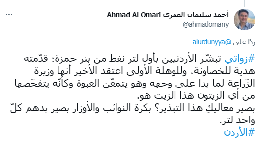 وتداول النشطاء صوراً وفيديوهات للحظة اهداء زواتي الزجاجة للخصاونة، وعلقوا عليها بمختلف الأشكال وبما لا يخلو من النكات والدعابة عن نفطنا الجديد وأول لتر من نفط الأردن.