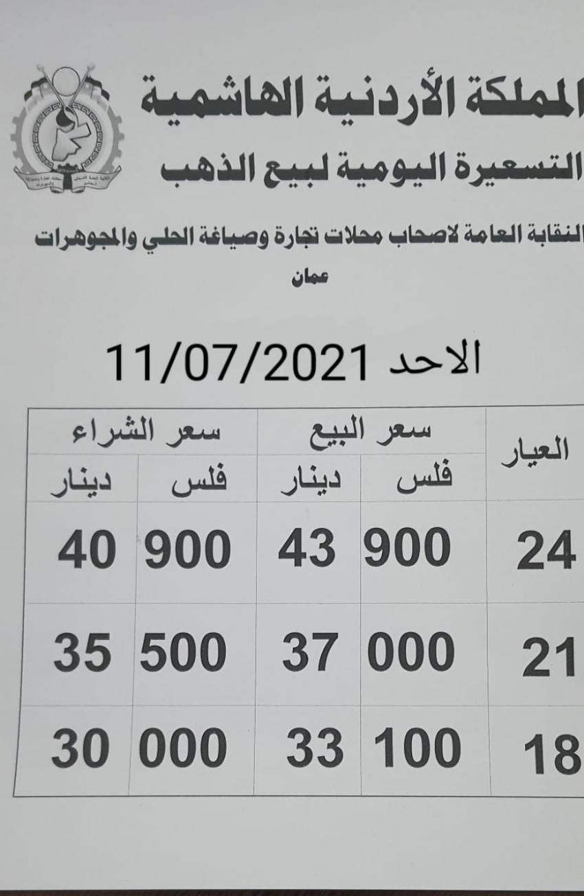 وبلغ سعر بيع الغرام من الذهب عياري 24 و18 لغايات الشراء من محلات الصاغة عند 43.9 و33.1 دينارا على التوالي.