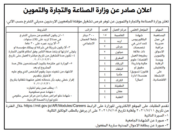 أحداث اليوم - أعلنت وزارة الصناعة والتجارة والتموين، عن توفر فرص تشغيل مؤقتة للجامعيين الأردنيين حديثي التخرج.
