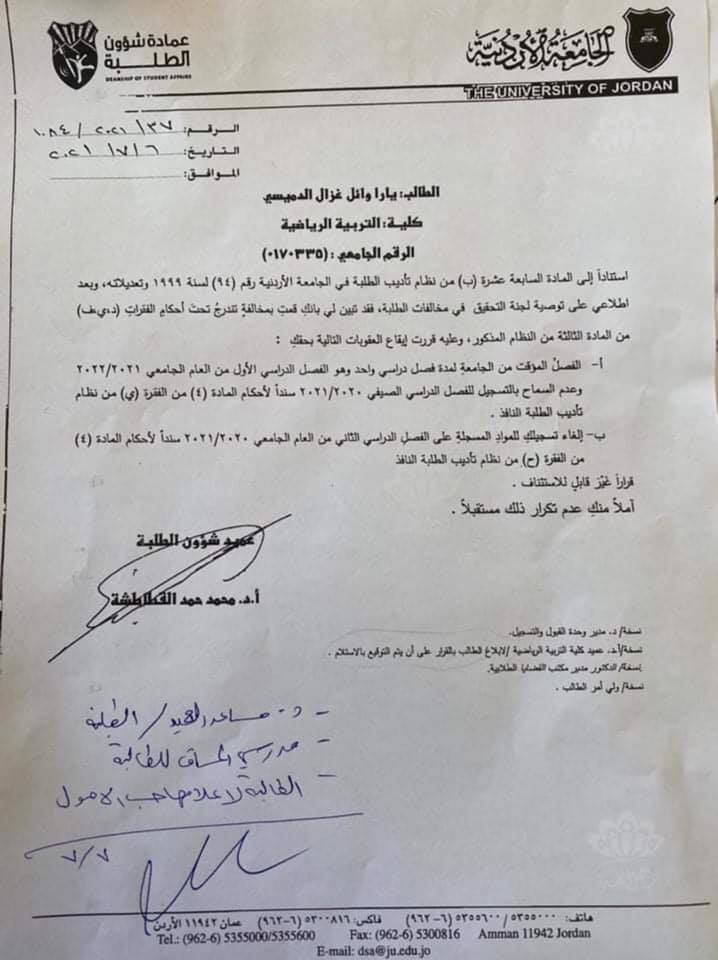 وجاء في قرار الجامعة الصادر من عميد شؤون الطلية الدكتور محمد القطاطشة، أن الطالبة خالفت التعاليمات، وتقرر فصل الطالبة الدميسي الفصل الدراسي الاول لعام 2020/2021، وعدم السماح بالتسجيل بالفصل الدراسي الصيفي، كما قررت الجامعة الغاء تسجيل المواد المسجلة للفصل الدراسي الثاني.