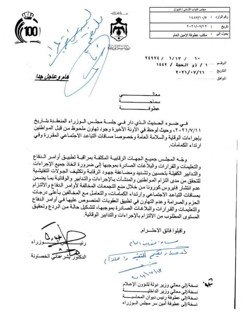 ووجه رئيس الوزراء الدكتور بشر الخصاونة كتابا الى الوزارات والمؤسسات وعلى ضوء الحديث الذي دار في جلسة مجلس الوزراء حيث لوحظ في الآونة الاخيرة وجود تهاون ملحوظ من قبل المواطنين باجراءات الوقاية والسلامة العامة وخصوصا مسافات التباعد الاجتماعي المقررة وفي ارتداء الكمامات مطالبا بمنع التجمعات المخالفة لاوامر الدفاع والالتزام بالتدابير الوقائية والسلامة العامة بارتداء الكمامات والمحافظة على مسافات التباعد الاجتماعي.