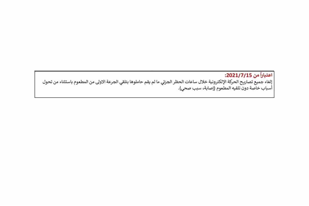 أحداث اليوم - تلغي الحكومة، اعتبارا من الخميس 15 تموز/يوليو، جميع تصاريح الحركة الإلكترونية خلال ساعات الحظر الجزئي، ما لم يقم حاملوها بتلقي جرعة المطعوم الأولى المضاد لفيروس كورونا المستجد.