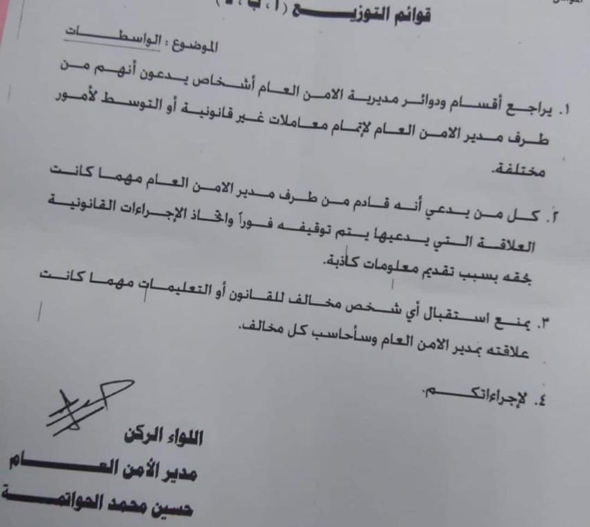 وقال الحواتمة في تعميمه، "يراجع أقسام ودوائر مديرية الأمن العام أشخاص يدعون أنهم من طرف مدير الأمن العام لإتمام معاملات غير قانونية أو التوسط لأمور مختلفة".