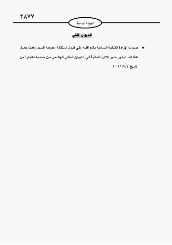 أحداث اليوم - صدرت الإرادة الملكية السامية بالموافقة على قبول استقالة رفعت جمال البدور من الإدارة المالية في الديوان وذلك وفق ما أوردته الجريدة الرسمية.