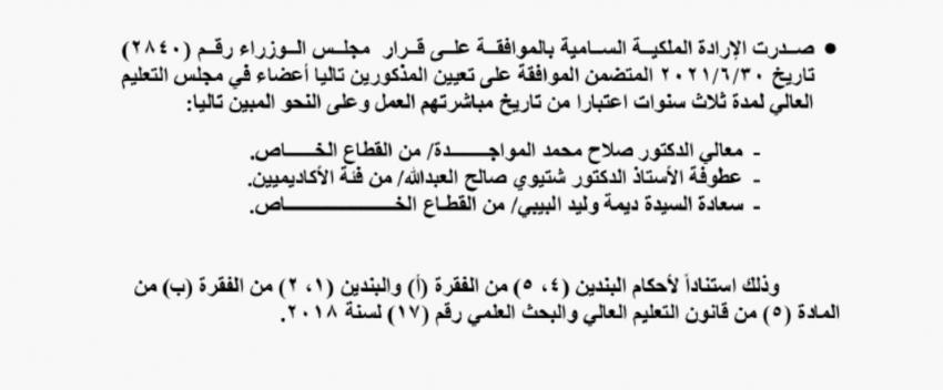 ارادة ملكية بالمواجدة والعبدالله والبيبي اعضاء في مجلس التعليم العالي