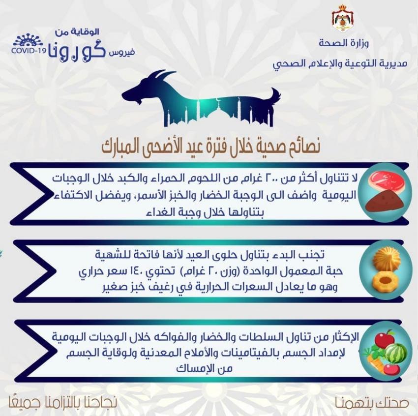 أحداث اليوم - وجهت مديرية التوعية والاعلام الصحي في وزارة الصحة نصائح للمواطنين خلال فترة عيد الأضحى المبارك.