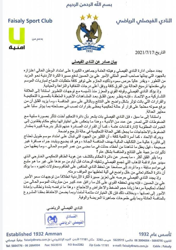 وواصل البيان: "إذ يجدد الفيصلي حرصه على تعزيز مسيرة الكرة الأردنية، انطلاقا من توجيهات الأمير علي بن الحسين، فإنه يبدي تحفظه القوي على كل ما رافق عددا كبيرا من مباريات الموسم الحالي من أخطاء تحكيمية، مردها زيادة حجم الضغط والاعتراض والاحتجاج".