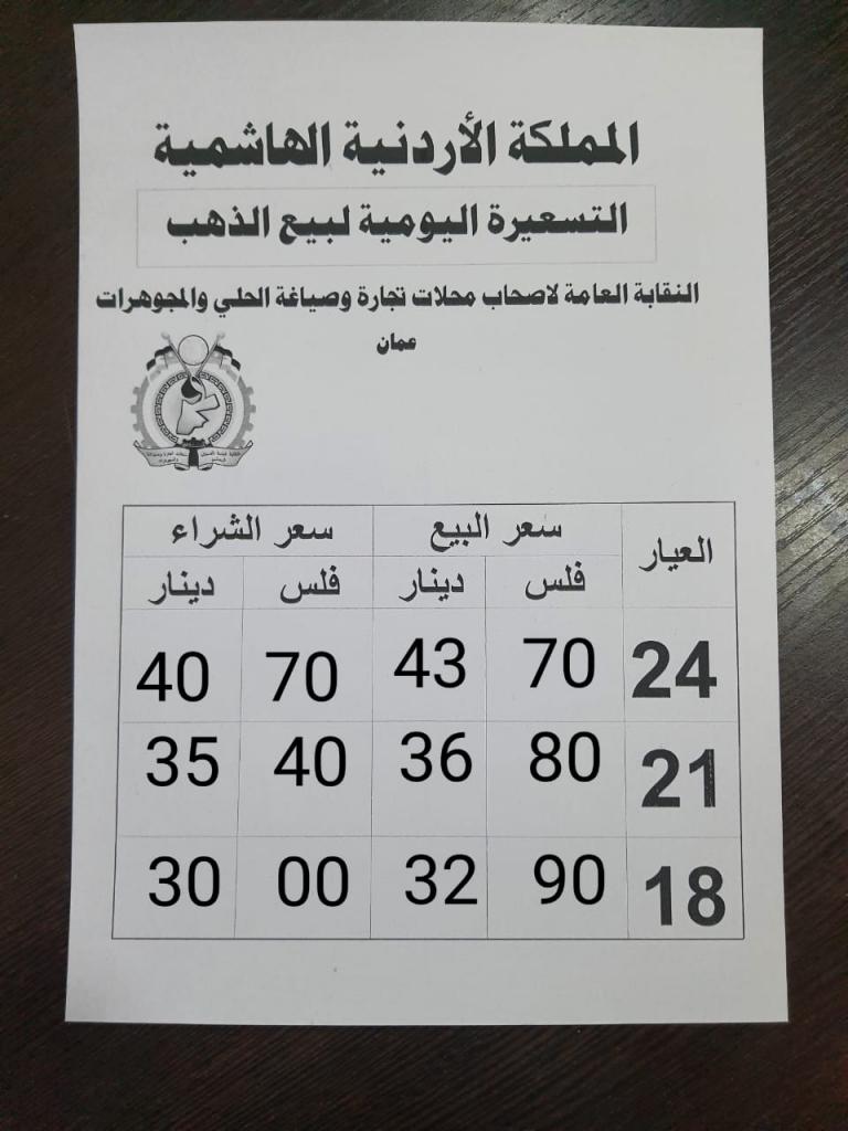 أحداث اليوم - أعلنت النقابة العامة لأصحاب محلات تجارة وصياغة الحلي والمجوهرات، الخميس، أسعار بيع وشراء الذهب في الأردن.