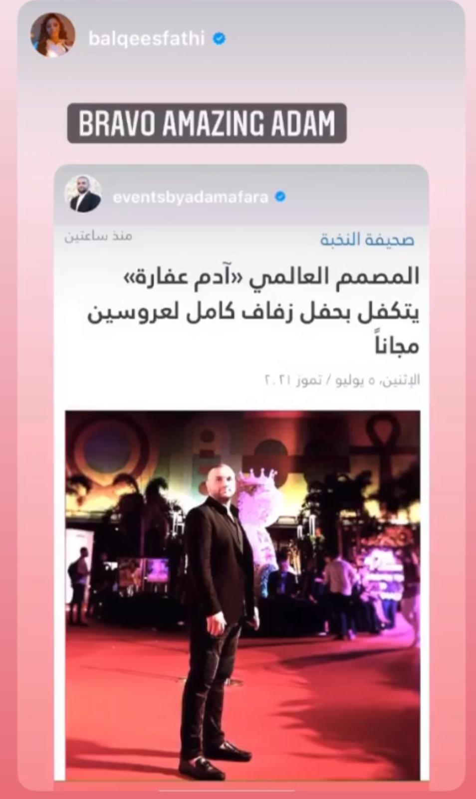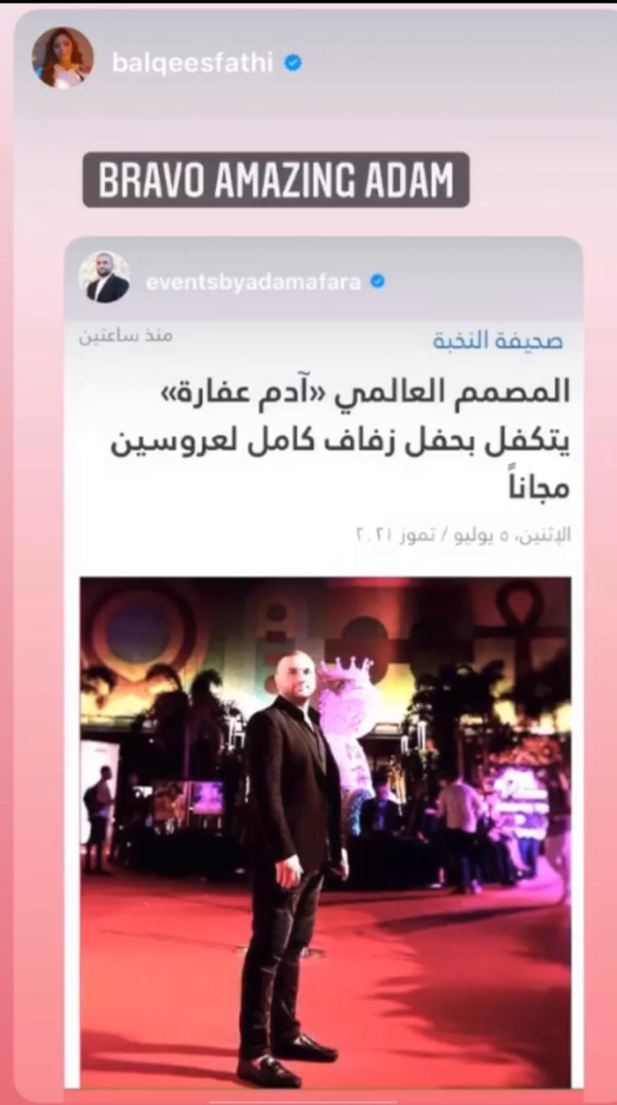 ومن الجدير بالذكر أن المصمم العالمي آدم عفارة سيتواجد قريبا في القاهرة للمرة الثانية خلال الفترة القادمة من اجل مجموعة من الحفلات والمشاريع التي سيعلن عنها قريبا.