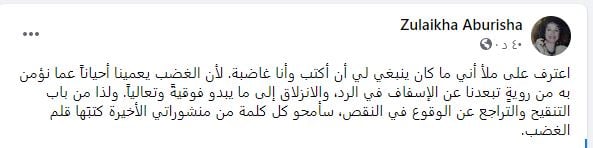 وقالت أبو ريشة في منشور لها عبر حسابها على الفيسبوك، السبت، "اعترف على ملأ أني ما كان ينبغي لي أن أكتب وأنا غاضبة. لأن الغضب يعمينا أحياناً عما نؤمن به من رويةٍ تبعدنا عن الإسفاف في الرد، والانزلاق إلى ما يبدو فوقيةً وتعالياً. ولذا من باب التنقيح والتراجع عن الوقوع في النقص، سأمحو كل كلمة من منشوراتي الأخيرة كتبَها قلم الغضب."
