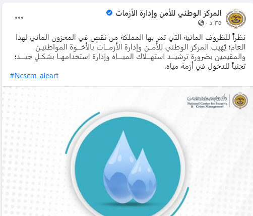 أحداث اليوم - اهاب المركز الوطني للأمن وإدارة الأزمات المواطنين والمقيمين ضرورة ترشيد استهلاك المياه وإدارة استخدامها بشكل جيد.وبين أن أهمية ذلك نظراً للظروف المائية التي تتعرض لها المملكة من نقصٍ في المخزون المائي لهذا العام.