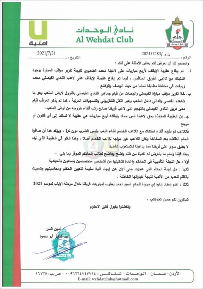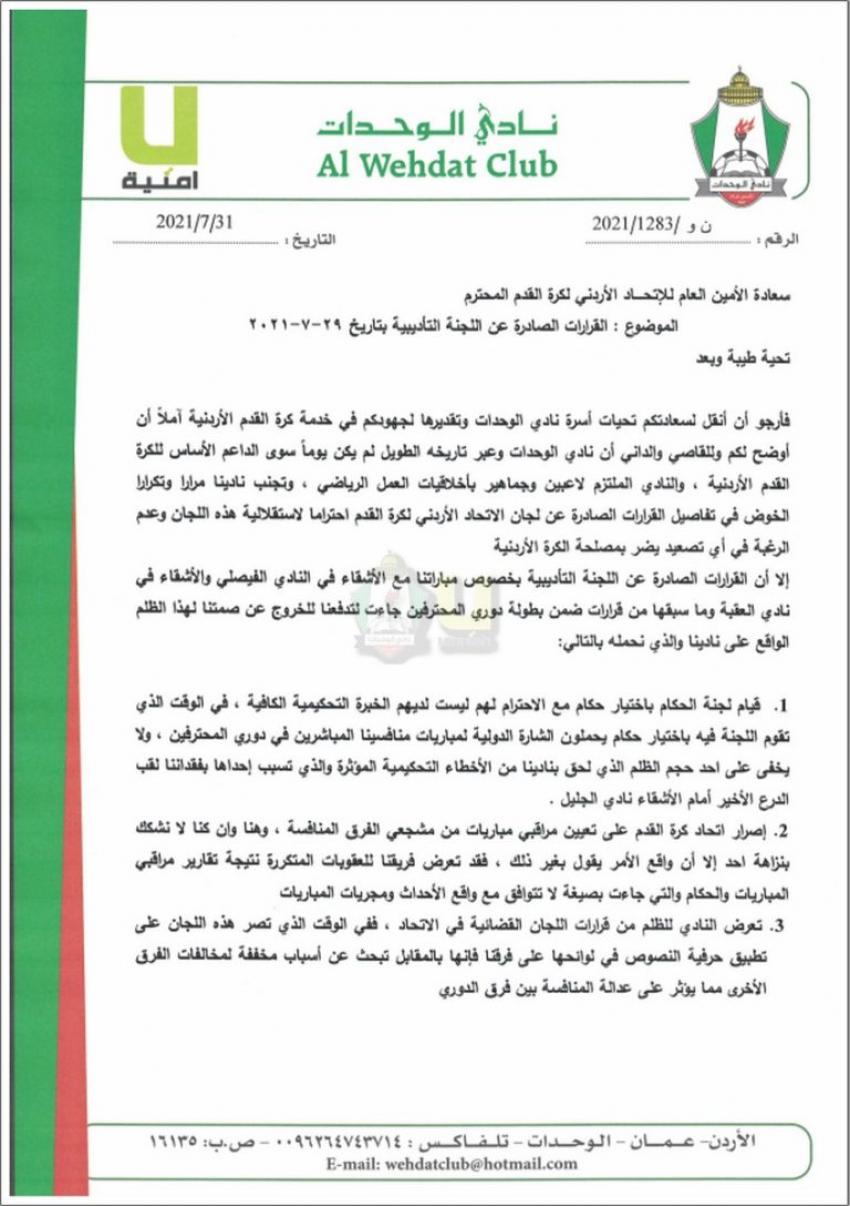 وكان نادي الوحدات أصدر بيانا صحفيا جاء فيه ما يلي بحسب ما افاد به الناطق الإعلامي لنادي الوحدات محمد غنام: