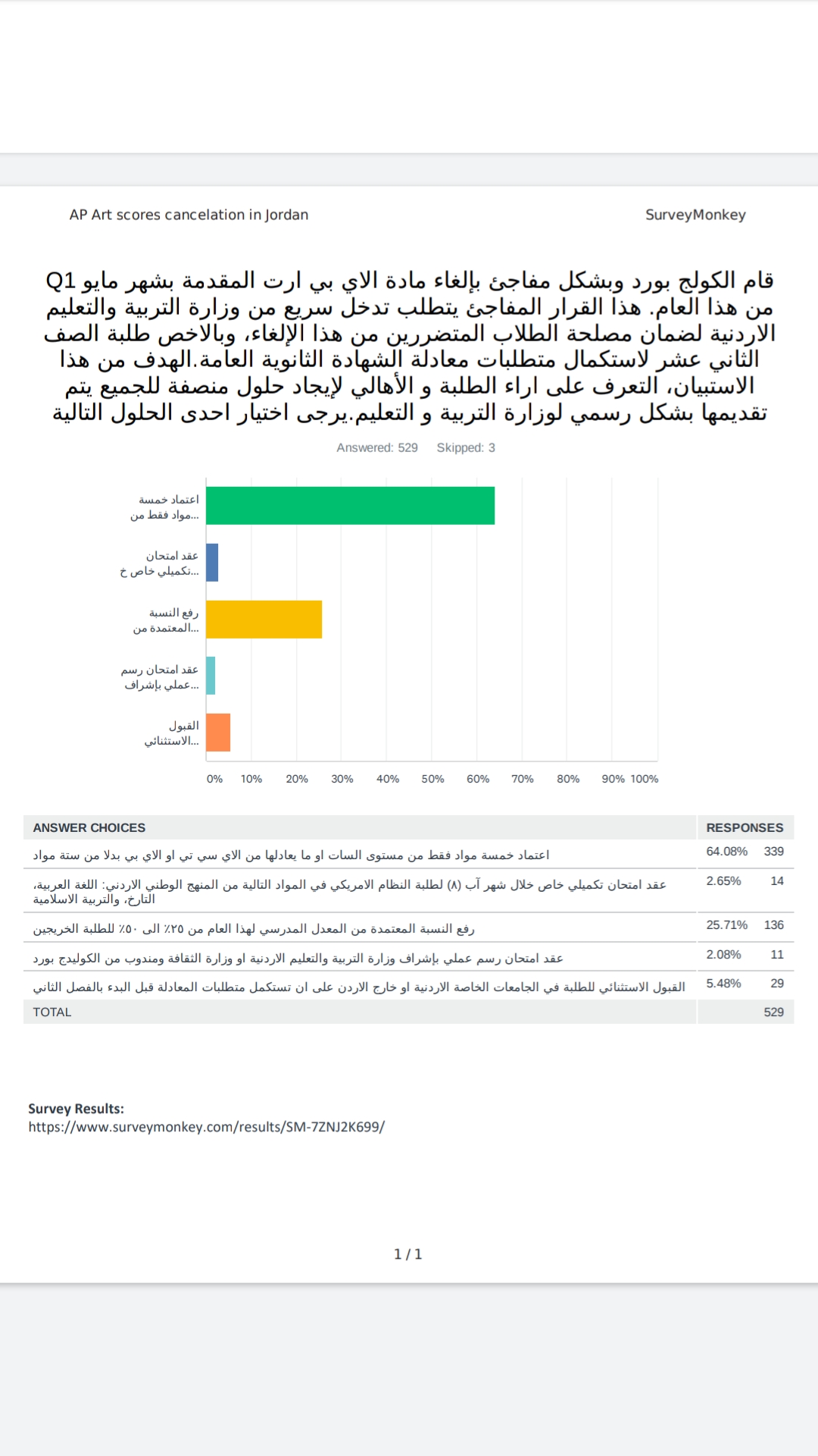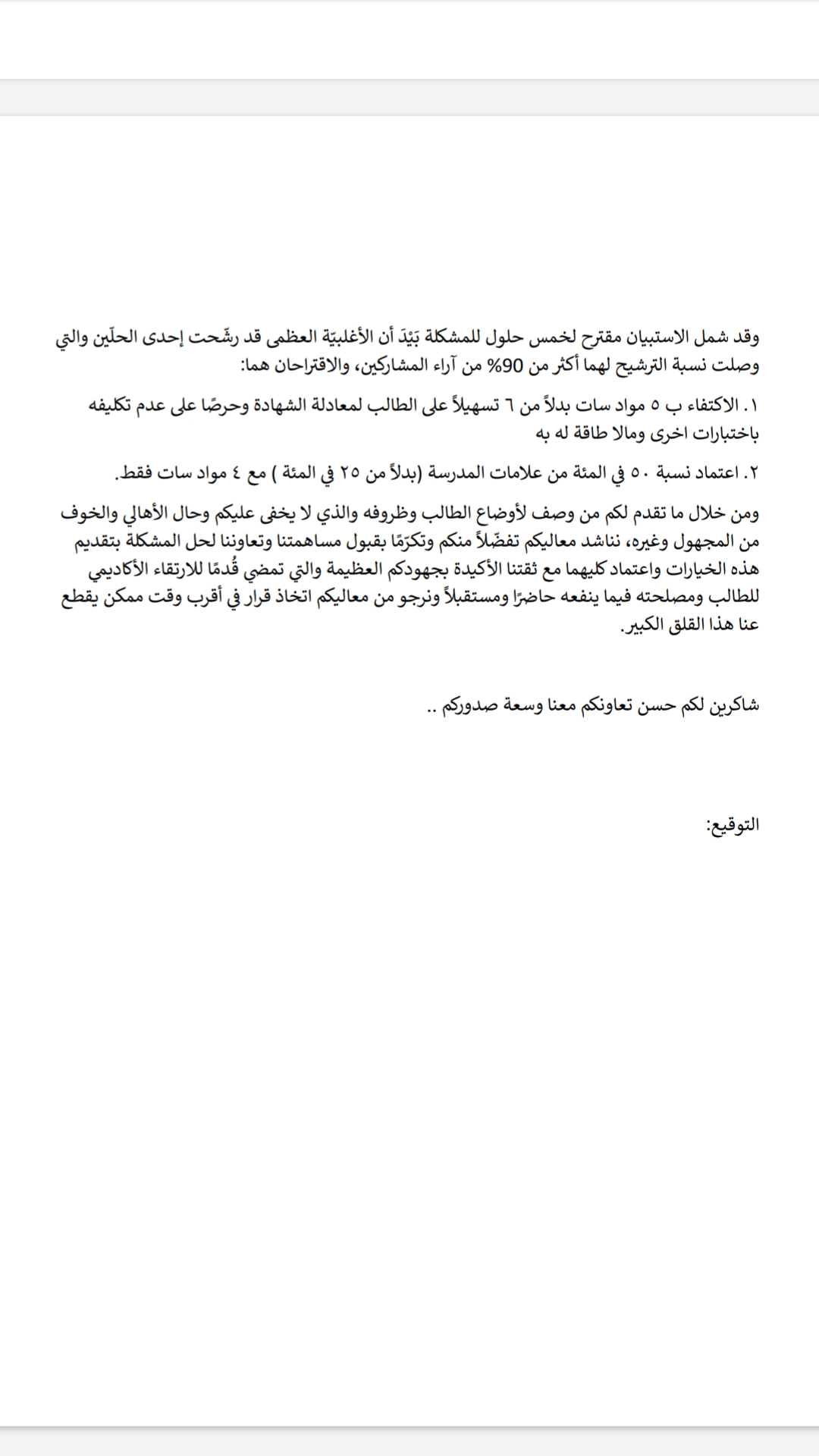 وقالوا نحن كطلبة و أولیاء أمور غیر مستعدین لنظام ACT ولم یطبق من قبل في بلدنا الحبیب و لیس لدینا أي فكرة عنھ و من غیر المستطاع دراسة المنھج كامل خلال شھر بعد توضیح المعلمین انه لا یمكن للطلبة التقدم للامتحان الا بعد دراسة المواد مدة لا تقل عن 3 شھور ویحتاج مدة طویلة لدراسته ولیس للنظام أي معلم متدرب و لدیھ المقدرة على تحضير الطلبة لھ و لیس لھا أیة كتب أو نماذج أسئلة سابقة حتى بتمكنوا من التقدم للامتحان، مبينين أنهم عندما قاموا بالتقدم للامتحانات التي قد عقدت یومي الجمعة و السبت الماضیین بتاریخ ٢٣ و ٢٠٢١/٧/٢٤ و كانت نسبة الرسوب فیھا مرتفعة و حتى لو ذكر ان ھناك نسبة نجاح لن تتجاوز ١٪ كانت النتیجة الأعلى 22 من 36.