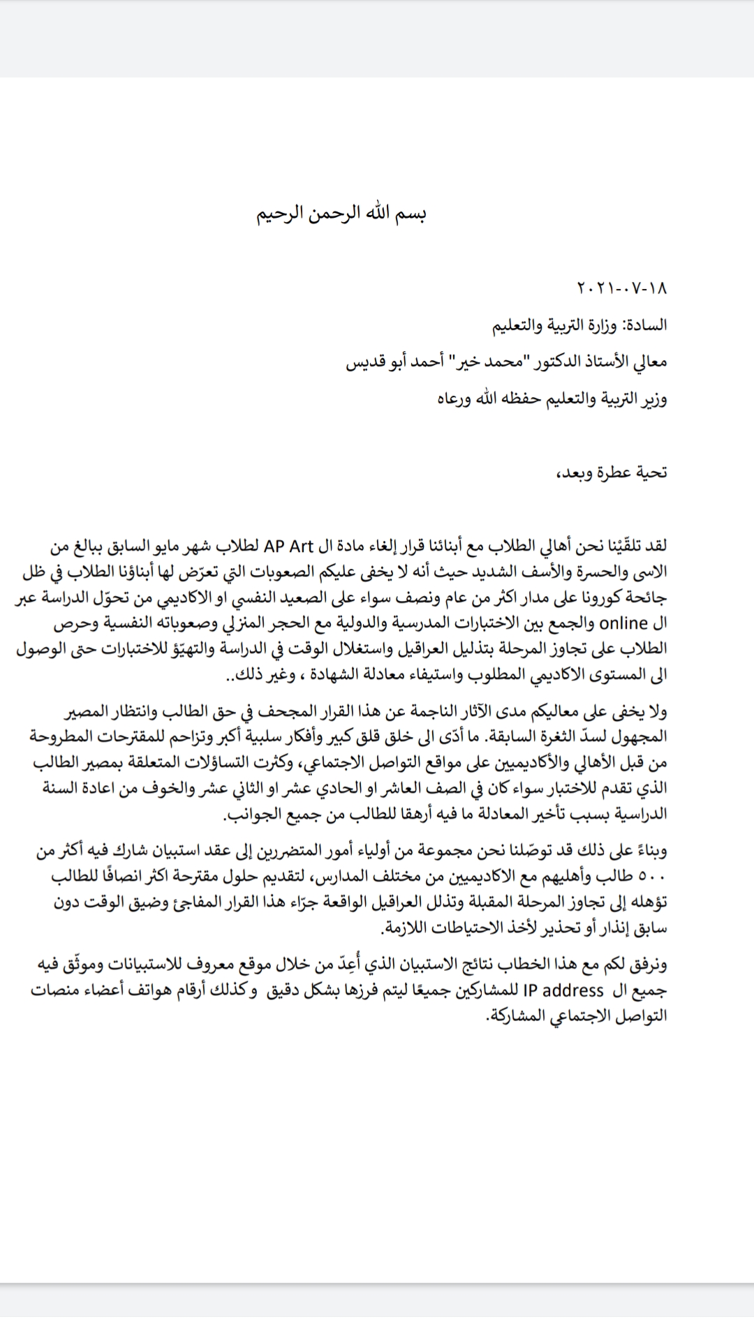أحداث اليوم - وجه أولياء أمور وطلبة على البرنامج الأمريكي لجيلي 2003 و2004 في النظام الأمريكي رسالة إلى وزير التربية والتعليم محمد ابو قديس حول ما تعرضوا له من الغاء امتحان (at subject test) ( منذ بدایة السنة الدراسیة ) 2020 - 2021 ( من الغاء امتحانات ومن توقیف النظام بشكل كلي، غیر ذلك الغاء نتائج بما یقارب التسعمائة طالب من أبناء الأردن في مدارس المملكة قبل ظھور نتائج الاختبار بأیام قلیلة جداً و لیس لدینا كطلبة متضررین أي حلول أخرى مما أدى الى تعب وارھاق لنا ولاولیاء امورنا حیث ان ھذه المادة تحسب لنا بمقدار مادتین والغائھا سوف یؤدي الى رسوب تسعمائة طالب وطالبة في مدارس المملكة وسوف یؤدي الى تحطیم جیل بأكمله ولیس لدینا الوقت الكافي ولا خیارات بدیلة لھا ایضاً بھذه الفترة القصیرة جداً و غیر ذلك انه لیس لدینا نحن كطلبة وأولیاء أمورنا الطاقة لتحمل المزید من الضغوطات النفسیة و المادیة وذلك بعد الظلم الواقع علیهم بمختلف الاشكال ومنذ بدایة ھذا العام الدراسي في (٢٠٢٠/-٢٠٢١).
