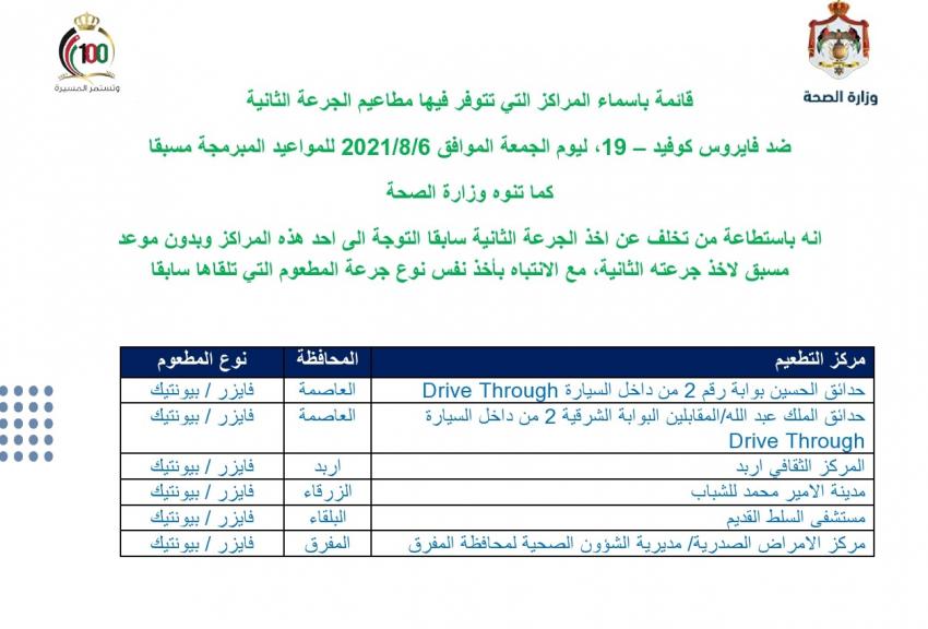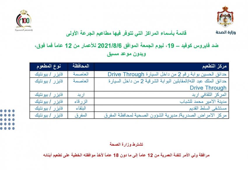 أحداث اليوم - أعلنت وزارة الصحة الخميس، قائمة بأسماء مراكز تطعيم جرعة اولى بدون موعد مسبق لمن هم فوق 12 سنة، الجمعة. كما أعلنت الوزارة مراكز تطعيم الجرعة الثانية. وتالياً المراكز: