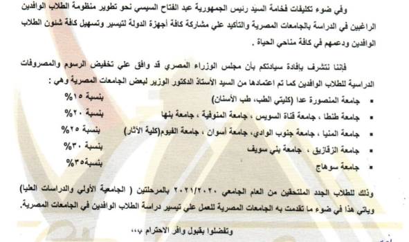 وقال المكتب في الإعلان، إنه ورد اليهم خطاب من الادارة المركزية لشؤون الطلبة الوافدين يبين تقديم عدد من الجامعات المصرية خصومات علي الرسوم الدراسية السنوية للطلبة الوافدين، وحسب ماهو مبين ادناه: