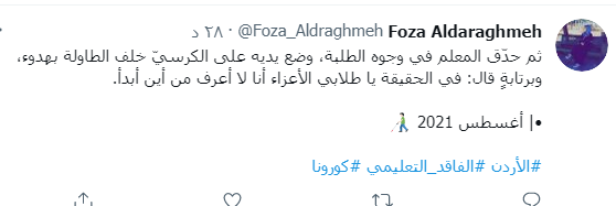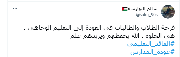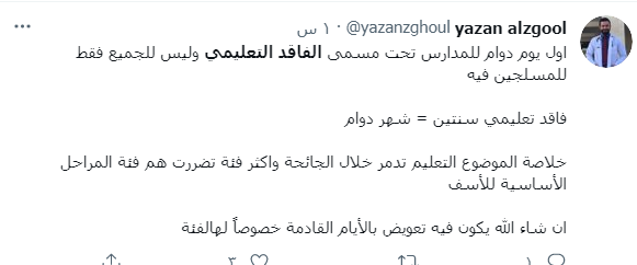 ودشن النشطاء وسم #الفاقد-التعليمي، معبرين من خلاله في تغريداتهم عن املهم ان يكون هذا التعويض مفيداً للطلبة بعد أن فاتهم الكثير في العام الماضي.
