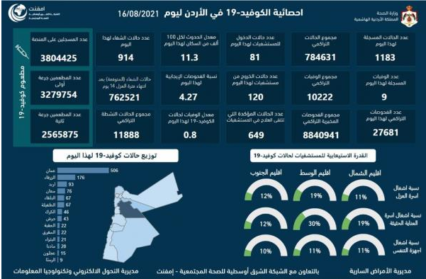 أحداث اليوم - سجل الأردن، الإثنين، 9 حالات وفاة، إضافة إلى 1183 إصابة جديدة بفيروس كورونا المستجد في البلاد.وتاليا الإيجاز الصحفي اليومي، الصادر عن وزارة الصحة، حول آخر مستجدات الوضع الوبائي في البلاد: