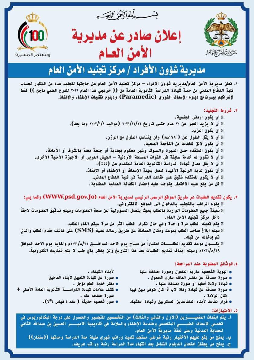 أحداث اليوم - اعلنت مديرية الأمن العام / مديرية شؤون الأفراد عن حاجتها لتجنيد عدد من الذكور لحساب كلية الدفاع المدني وفق الشروط المبينة في الإعلان أدناه.