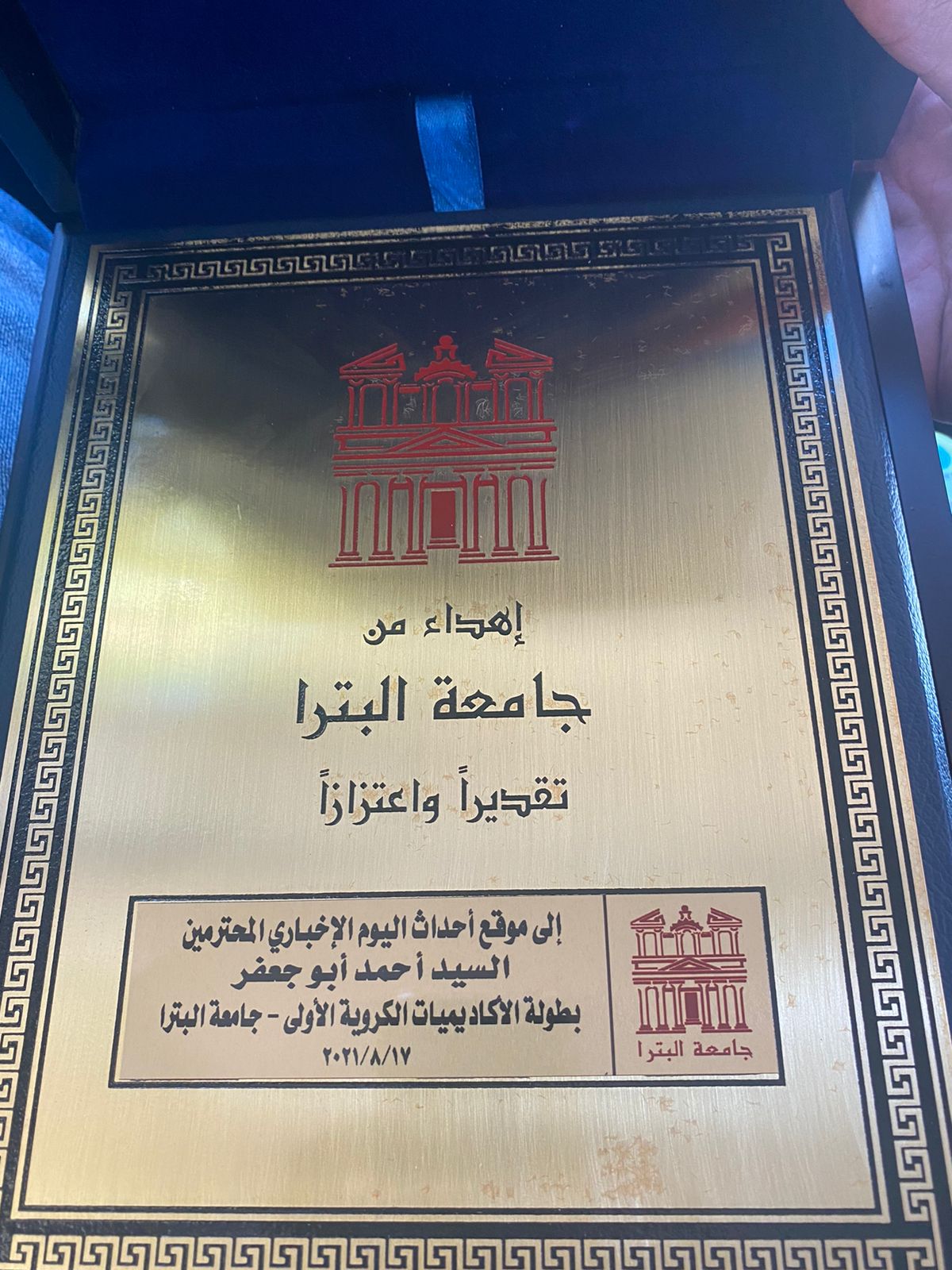 وكرمت إدارة الجامعة موقع "أحداث اليوم" بعد تغطيته لأحداث البطولة، حيث استلم ناشر الموقع السيد أحمد أبو جعفر درعا تكريميا من راعي الحفل.