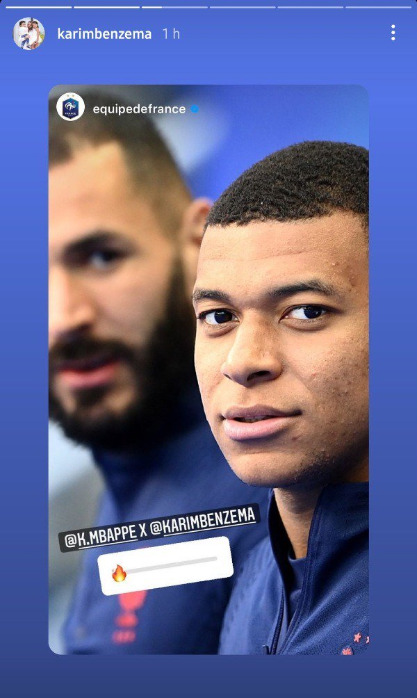 ونشرت صحيفة "ليكيب" الفرنسية، صورة عبر "ستوري إنستجرام"، تجمع بين بنزيما ومبابي في صفوف منتخب فرنسا، ليقوم مهاجم ريال مدريد، بإعادة نشرها عبر حسابه.