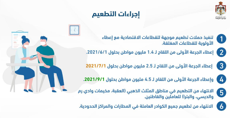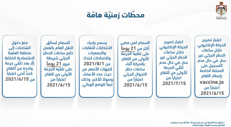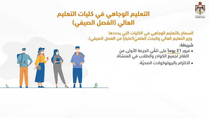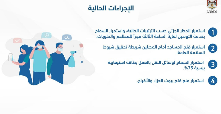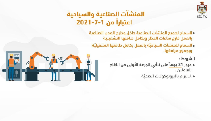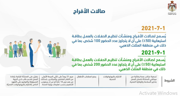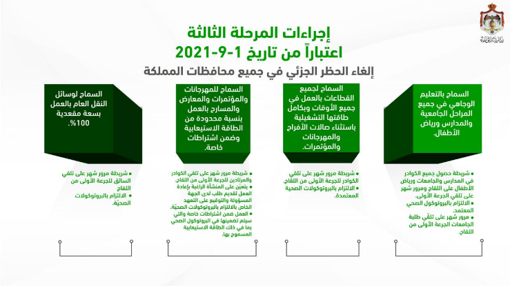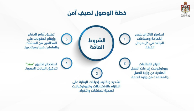 واكدت الحكومة إنه وبموجب خطة الوصول إلى الصيف الآمن وأوامر الدفاع والبلاغات ذات العلاقة يمنع دخول دور السينما ومدن الترفيه والتسلية وأماكن لعب الأطفال ومراكز الألعاب الكهربائية والإلكترونية والمراكز التعليمية والثقافية والتقنية واكاديميات ومراكز التدريب المهني والحمام التركي والشرقي والأندية الصحية وأماكن تقديم الارجيلة والملاعب الرياضية وصالات الأفراح ومنشات تنظيم الحفلات.