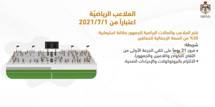 كما يمنع لغير الحاصلين على الجرعة الأولى من المطعوم ولم يمض عليها 21 يوما دخول المراكز والاكاديميات الرياضية ومراكز اللياقة البدنية والأندية الرياضية ومراكز البلياردو والسنوكر الترويحية الرياضية والمسابح العامة والمسابح الداخلية الموجودة في المنشات الفندقية والمسابح في المجمعات السكنية.