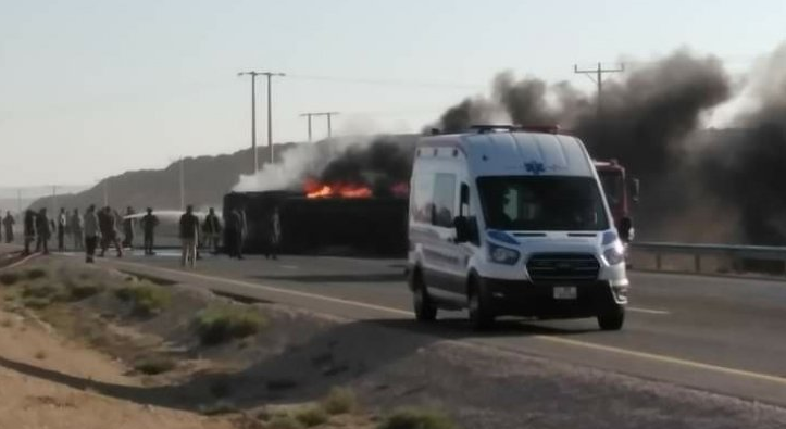 وقالت الدوريات الخارجية إن الحادثة تسببت بإغلاق السير القادم من عمان بإتجاه الجنوب وبالعكس لفترة زمنية قصيرة نتيجة إحتراق صهريج محمل بمادة الديزل على الطريق الصحراوي.