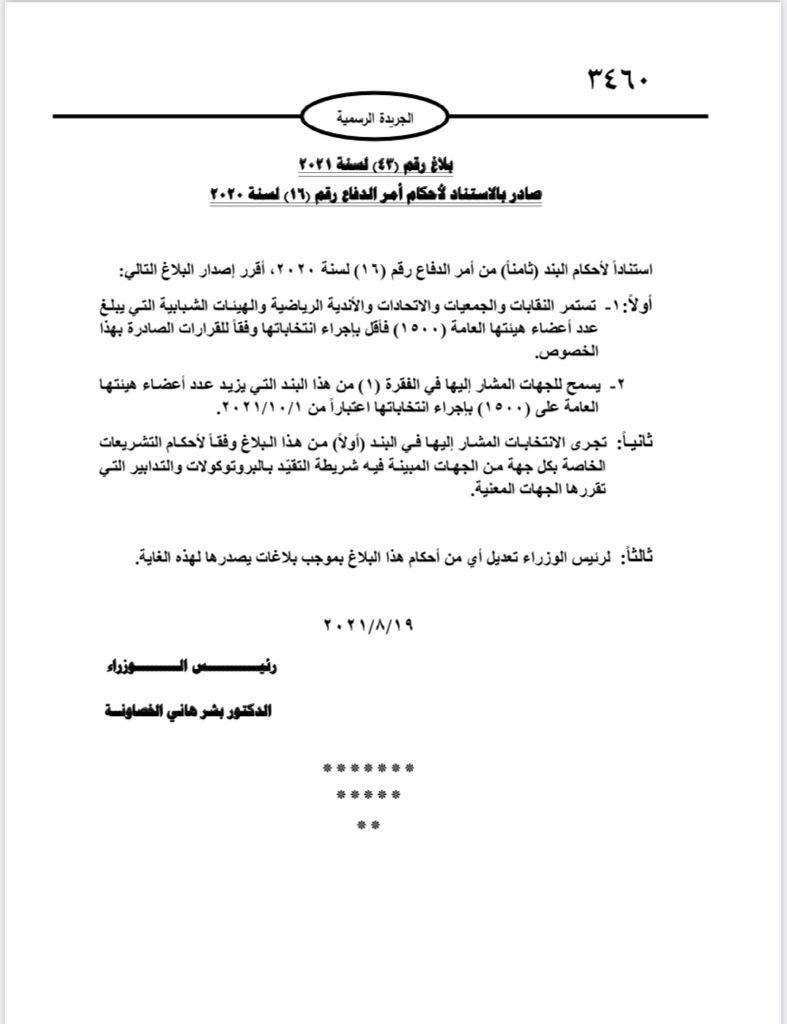 أحداث اليوم - رئيس الوزراء الدكتور بشر الخصاونة يصدر البلاغ رقم (43) لسنة 2021 لتنظيم إجراء انتخابات النّقابات، والجمعيّات، والاتحادات والأندية الرياضيّة، والهيئات الشبابيّة.