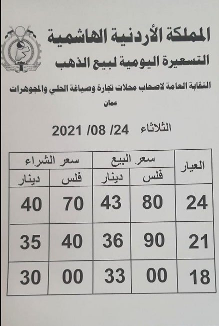وارتفع سعر بيع غرام الذهب عيار 21 الأكثر طلبا في السوق المحلية بمقدار 30 قرشا ليصل إلى 36،90 ديناراً، لغايات شراء المواطنين من محلات الصاغة، مقابل 35،40 دينارا لجهة البيع.