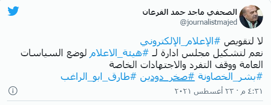 وصف مغردون قرار هيئة الإعلام بأنه جاءت للتضيق على المؤسسات الإعلامية والحريات الصحفية والأفراد والصحفيين في الأردن.