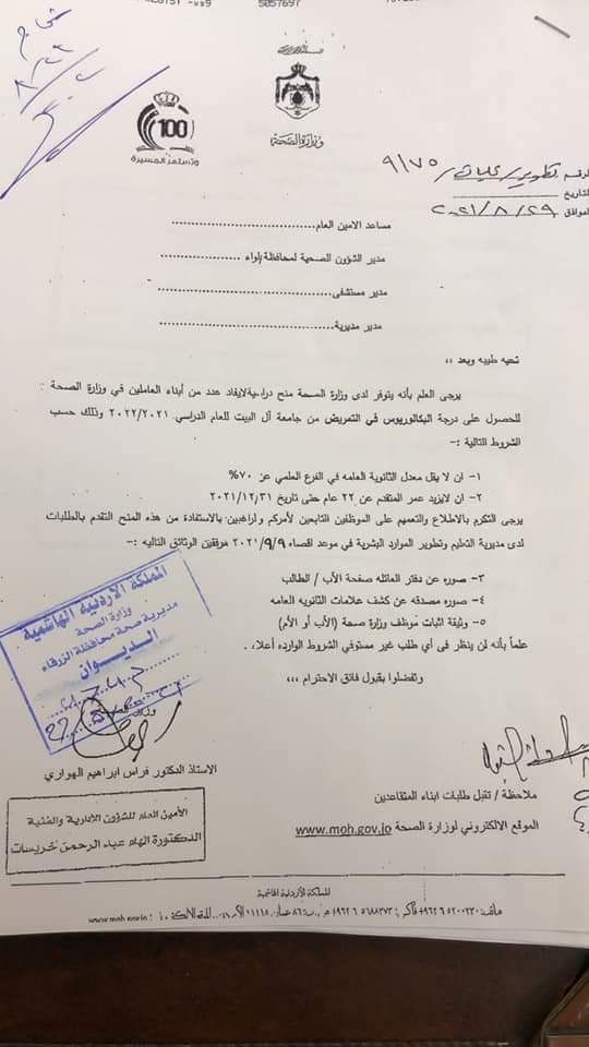 أحداث اليوم - أعلنت وزارة الصحة، عن توفر منح دراسية لإيفاد مجموعة من أبناء العاملين في الوزارة للحصول على درجة البكالوريوس في التمريض من جامعة آل البيت.