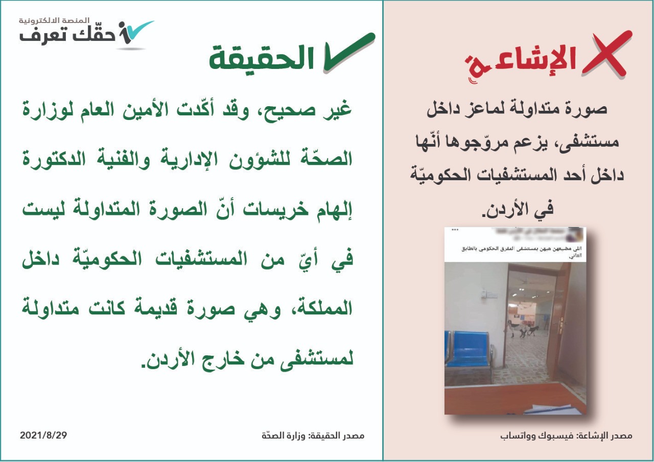 أحداث اليوم - نفت وزارة الصحة صحة صورة متداولة لماعز يزعم مروجوها أنها في الأردن.وقالت الأمين العام للوزارة للشؤون الإدارية والفنية الدكتور إلهام خريسات إن الصورة المتداولة ليست في أي من المستشفيات في الأردن وهي قديمة.
