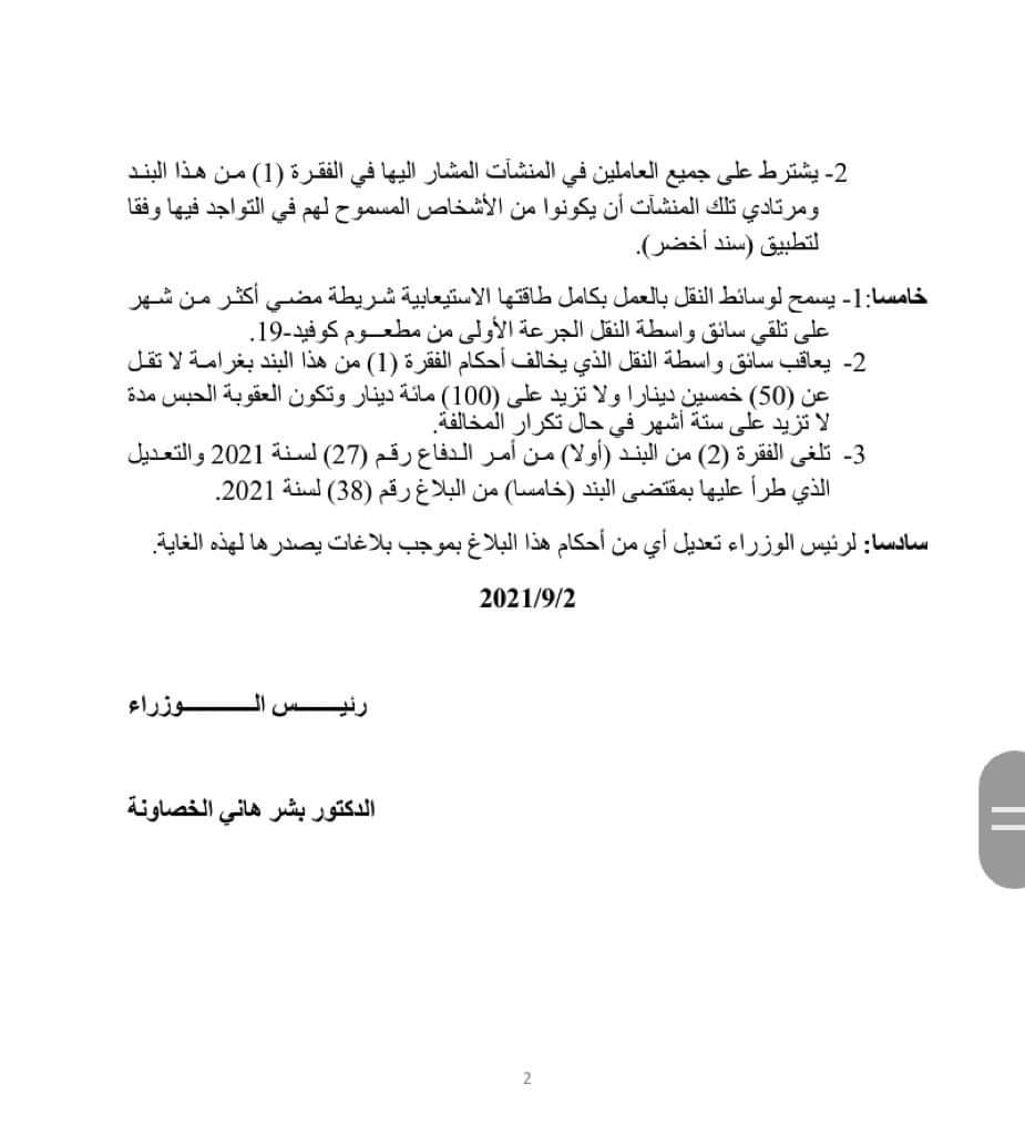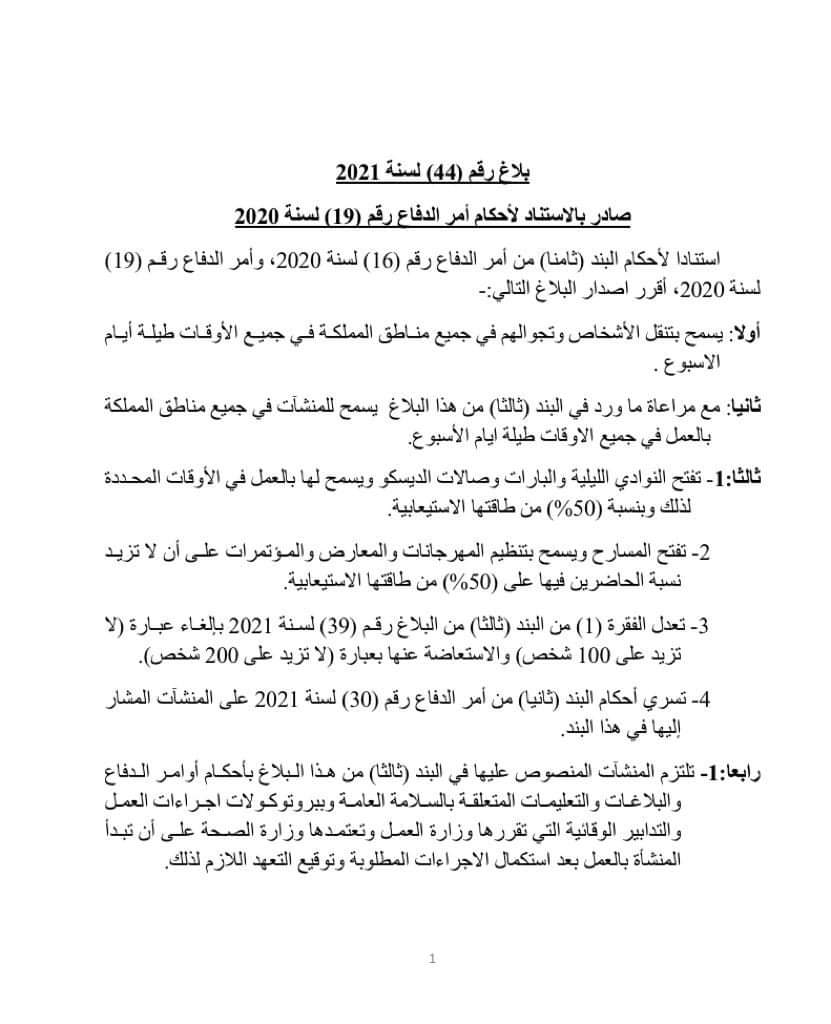 أحداث اليوم - أصدر رئيس الوزراء الدكتور بشر الخصاونة البلاغ رقم (44) لسنة 2021م الذي يسمح بتنقّل الأشخاص وتجوالهم وللمنشآت في جميع مناطق المملكة، بالعمل في جميع الأوقات، وطيلة ايام الأسبوع.وفي ما يلي نصّ البلاغ: