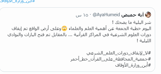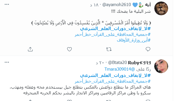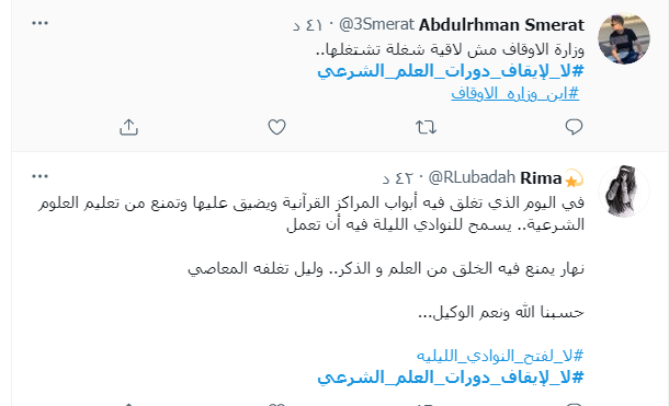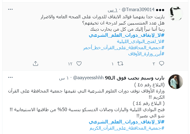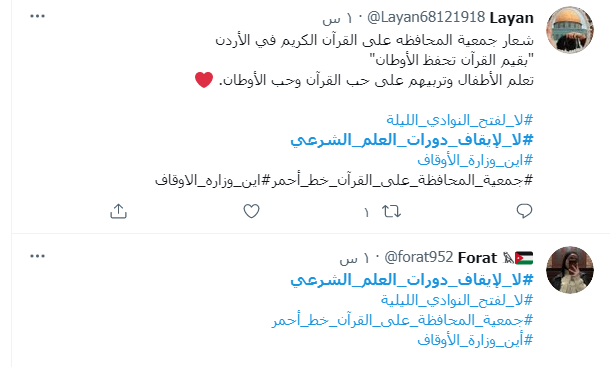 وقال النشطاء عبر وسم #لا_لايقاف_دورات_العلم_الشرعي، الذي تصدر قائمة الترند في الأردن، إنه لا يوجد اي مبرر لإيقاف عقد هذه الدورات، خاصة في الوقت الذي سمحت فيه الحكومة بفتح النوادي الليلة والبارات والمسارح.