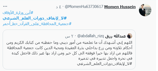 أحداث اليوم - تفاعل نشطاء مواقع التواصل الإجتماعي مع "العاصفة الاكترونية" عبر تويتر وفيسبوك لمطالبة وزارة الاوقاف والشؤون والمقدسات الاسلامية باعادة السماح بعقد دورات العلوم الشرعية في مراكز تحفيظ القران الكريم.