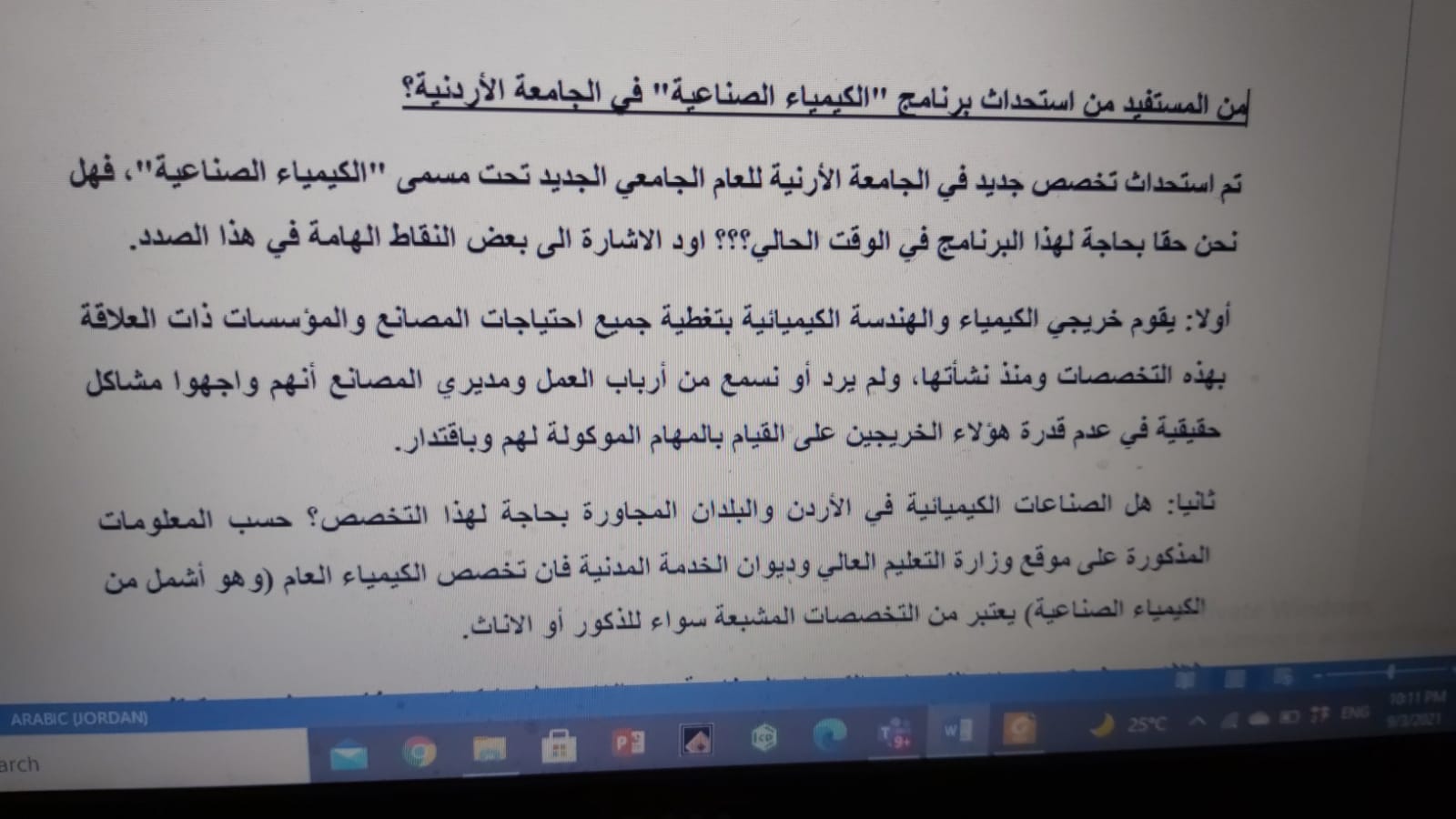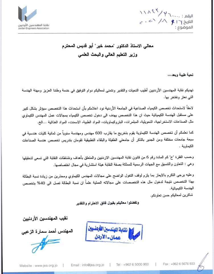 أحداث اليوم - استنكرت نقابة المهندسين الأردنيين، استحداث تخصص الكيمياء الصناعية في الجامعة الأردنية كتخصص جديد.