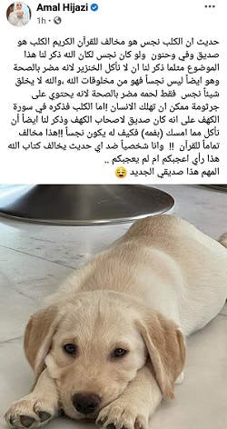 و كتبت أمل حجازي عبر حسابها بموقع (فيسبوك): (حديث ان الكلب نجس هو مخالف للقرآن الكريم الكلب هو صديق وفي وحنون ولو كان نجس لكان الله ذكر لنا هذا الموضوع مثلما ذكر لنا ان لا نأكل الخنزير لانه مضر بالصحة وهو ايضاً ليس نجساً فهو من مخلوقات الله، والله لا يخلق شيئاً نجس فقط لحمه مضر بالصحة لانه يحتوي على جرثومة ممكن ان تهلك الانسان!).