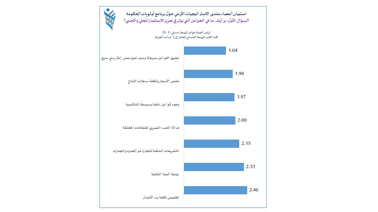 أحداث اليوم - أشار منتدى الاستراتيجيات الأردني إلى أن أولويات تحديد عوامل تعزيز الاستثمار المحلي والأجنبي، تبدأ في تطبيق القوانين بسهولة وبدون تمييز ضمن إطار زمني سريع، يليها خفض الأسعار وتكلفة مدخلات الإنتاج، ثم وجود قوانين ناظمة ومبسطة للتنافسية.