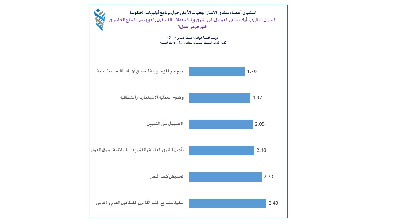 وحول العوامل التي تؤثر في زيادة معدلات التشغيل وتعزيز دور القطاع الخاص، أشار أعضاء المنتدى إلى أولوية منح حوافز ضريبية لتحقيق أهداف اقتصادية عامة يليها وضوح العملية الاستثمارية والشفافية، ثم الحصول على التمويل، ثم تأهيل القوى العاملة والتشريعات الناظمة لسوق العمل، يليها تخفيض كلف النقل ، وتنفيذ مشاريع الشراكة بين القطاعين العام والخاص.